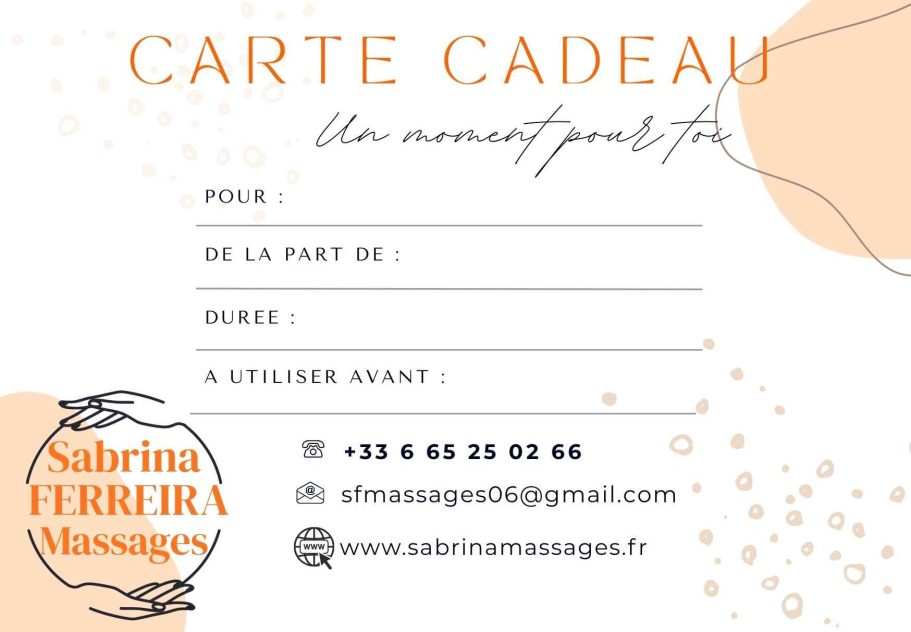 Offrez un moment de détente et de sérénité avec les bons cadeaux massage Sabrina FERREIRA Massages Antibes.